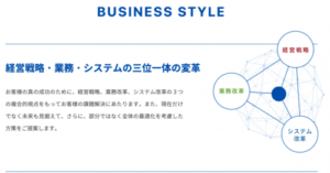 - ITコンサルティング&サービス事業とビジネスイノベーション事業の二つの柱で運営。特にITコンサルティング&サービス事業に重点を置いている。