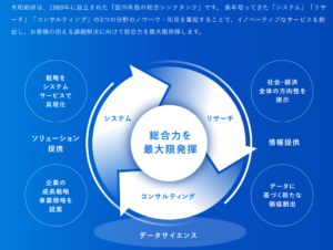 • 業務内容: 大和総研は、システム、リサーチ、コンサルティングの3つの部門で構成されており、これらが連携して社会に新しい価値を提供しています。特にデータサイエンスに力を入れています。